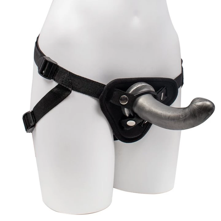 Take a shine to the Marbled Silver Curved Strap-On. This 6-inch, curved dildo is ready to tease and please for intense G-spot stimulation or P-spot excitement. For his or her pleasure, let the thick tip rest against your sweet spot and experience deep, toe-curling satisfaction with your partnerβs every thrust.